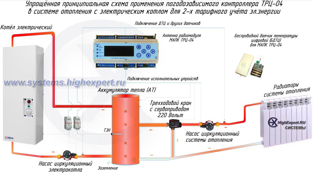 объединённые трубопроводами; включение и выключение электрокотла, циркуляционных насосов, электрического сервопривода трёхходового смесительного крана, осуществляется российским погодозависимым контроллером ТРЦ-04 по специальному алгоритму для 2-х тарифного учёта электроэнергии.