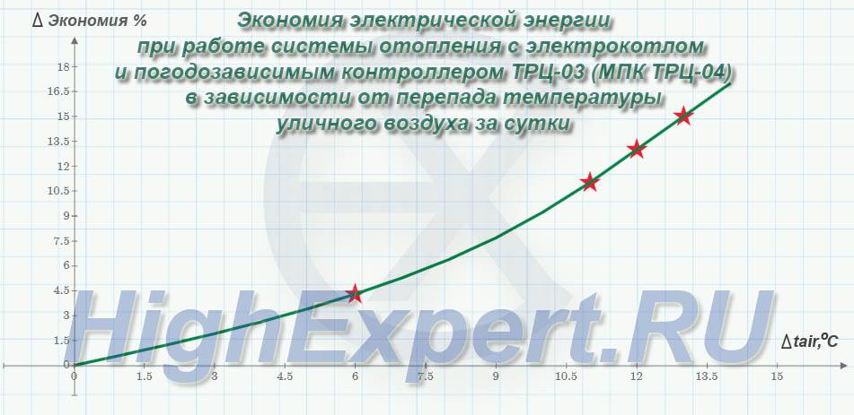 Этот же график можно применить для терморегулятора МПК ТРЦ-04, принимая во внимание, что реальная экономия электроэнергии может быть несколько больше за счёт более высокого КПД электрического котла.