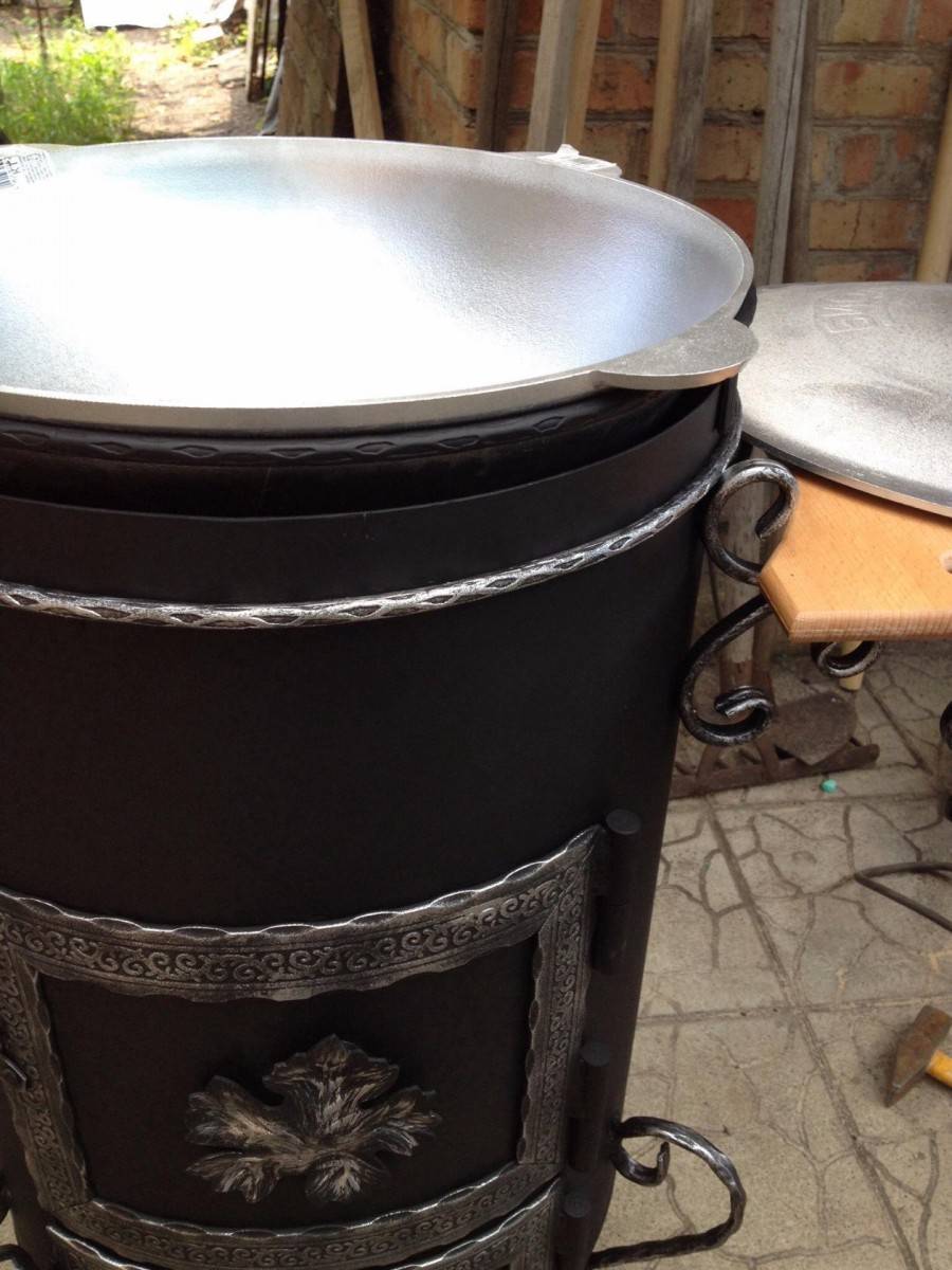 - Сбоку вверху вырезается отверстие для трубы. Можно и топить, и готовить еду одновременно.