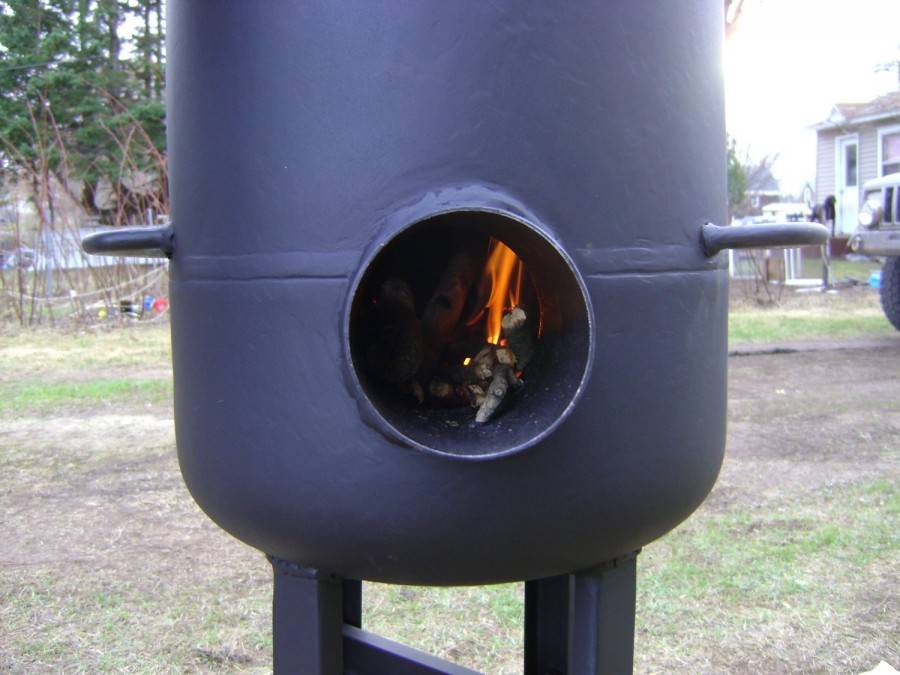 Бак ресивер отлично подойдет для изготовления печи. Дверцу для загрузки дров можно не делать. Сверху откидывается крышка люка, через которую будут загружаться дрова. Она оснащается ручкой для удобства использования. Внизу вырезается отверстие для забора пепла. Советуем подробнее изучить схему буржуйки на дровах и найти ответы на интересующие вопросы.