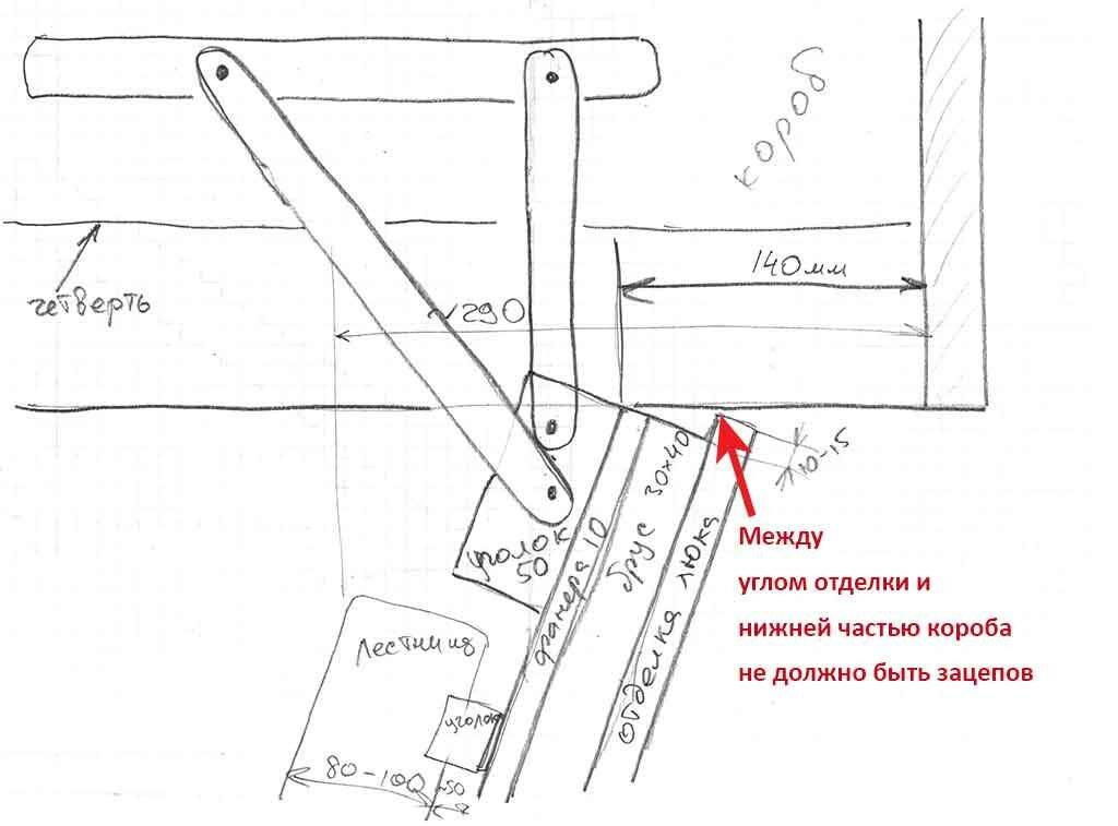Высота короба люка зависит в основном от параметров лестницы, которая с ним идет или проектируется. Нередко эта высота не совпадает с толщиной чердачного перекрытия, но это не страшно и обычно на практике не вызывает каких-либо сложностей.