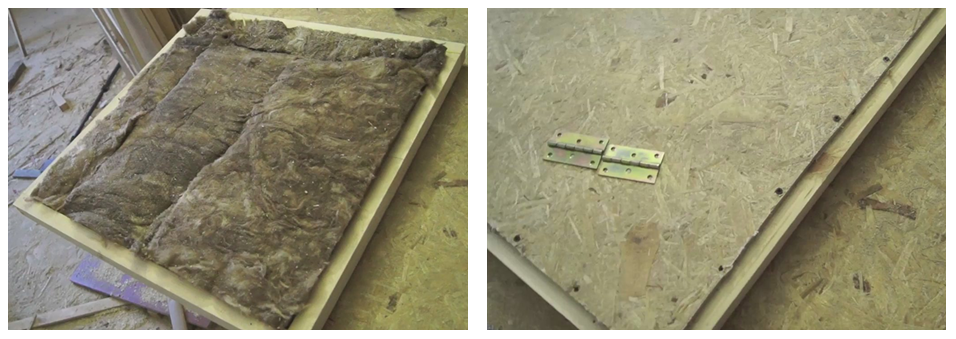 - Дальше закладываем внутрь дверного полотна утеплитель, к примеру, базальтовую вату и прикручиваем сверху второй лист ОСП.