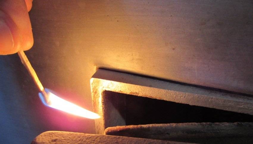 - зажженной спичкой или бумагой, поднесенных к открытой топке;