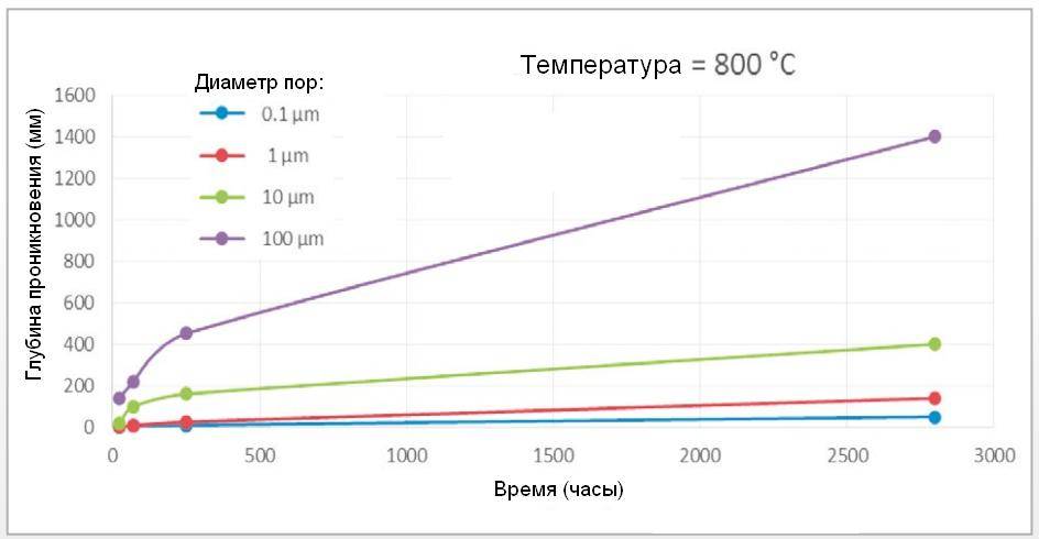 Рисунок 4 – Проникновение алюминия в футеровку в зависимости от диаметра пор