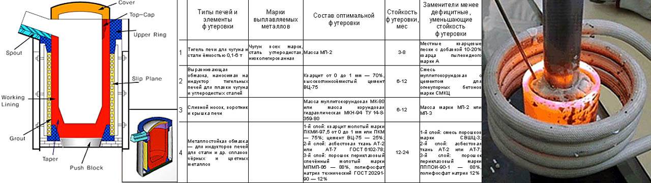 Дополнительное условие – изношенная футеровка должна быть выталкиваемой, т.к. делается она торкретированной (в малых печах сплошной набивной), а разборка негодного тигля – тяжелая, вредная и опасная работа. Расплав металла в индукторной печи греется по всей массе, очень текуч и сквозь штучную футеровку просочится, а льют его наклоном всей печи. В результате футеровка индукторной печи превращается в сложную многокомпонентную конструкцию (слева на рис.), части которой выполняются из разных составов. Табл. в центре на рис. содержит сведения лишь о малой их доле (МП-2 – марка одной из муллитовых масс); (больше, да и то с оговорками, можно почерпнуть отсюда: studfiles.net/preview/1864729/page:4/).
