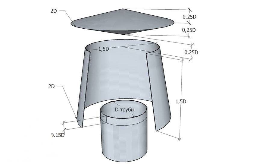 Поскольку от точности изготовления зависит качество работы дефлектора, составление правильного чертежа — это самый важный этап во всём процессе. Размеры выверялись учёными в аэродинамической трубе, и им обязательно нужно следовать. Параметр, от которого нужно отталкиваться, — диаметр канала дымохода D.