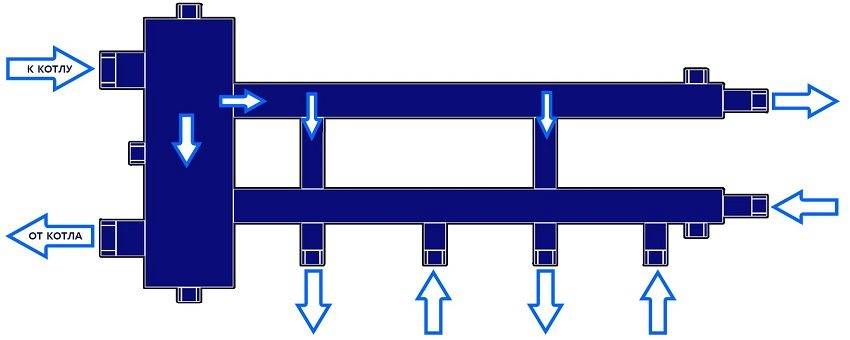 В коллектор, из котла поступает поток нагретой жидкости. Внутри устройства осуществляется разделение теплоносителя по отводам, подключенным к каждой отдельной системе отопления. Дополнительно, коллектор позволяет отключать и ремонтировать отдельные контуры, не отключая обогрева дома.
