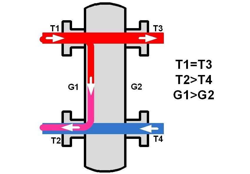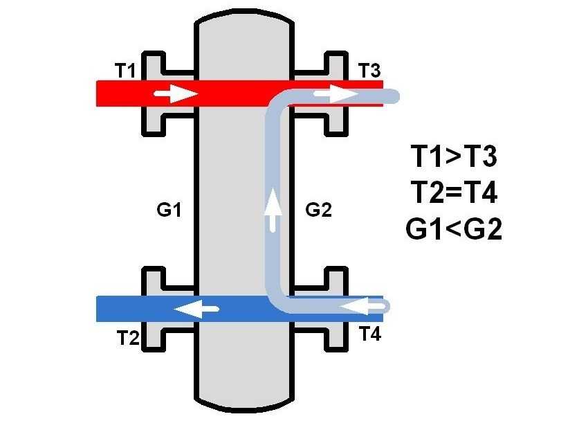 Например, есть тепловой поток контура котла и тепловой поток контура отопительных приборов (радиаторов). Нестандартной конструкцией, где перпендикулярное направление потоков, скорость потока второстепенного контура с приборами нагрева значительно возрастает.