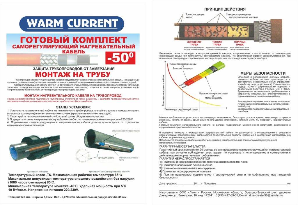 — Обогрев водопроводных труб саморегулирующимся греющим кабелем позволит игнорировать теплые участки и направлять ток на холодные. Он одобрен для резки, поэтому не возникнет проблем с его установкой даже в труднодоступных местах. Длина кабеля не влияет на мощность нагрева.