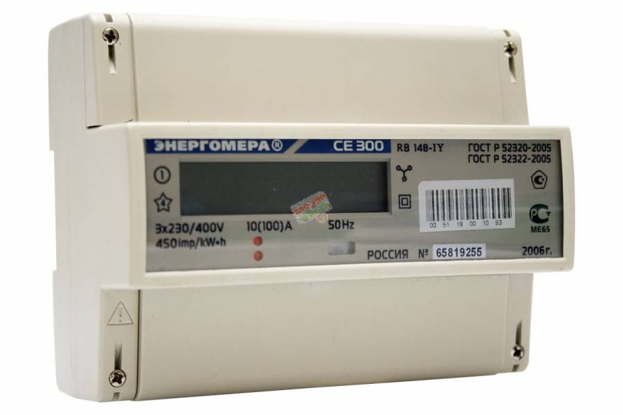 - Энергомера СЕ300 R31145-J – прибор для трехфазной сети. Однотарифная модель имеет ЖК-дисплей, световой индикатор. К сети можно подключить через трансформатор. Монтируется на DIN-рейку. Счетчик устойчив к низким температурам, поэтому может быть установлен в неотапливаемом помещении. Есть защита от кражи электроэнергии.