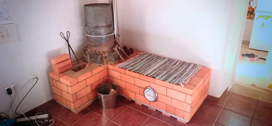 Эта идея нашла свою реализацию в массивных конструкциях с лежанкой в форме дивана или кровати. Такую ракетную печь изготавливают из кирпича или бутового камня, декорируя пластичной массой из глины и опилок. Благодаря высокой теплоёмкости используемых материалов печь может удерживать тепло всю ночь, что в сочетании с высокой экономичностью делает отопительный агрегат весьма привлекательным для монтажа в жилых помещениях.