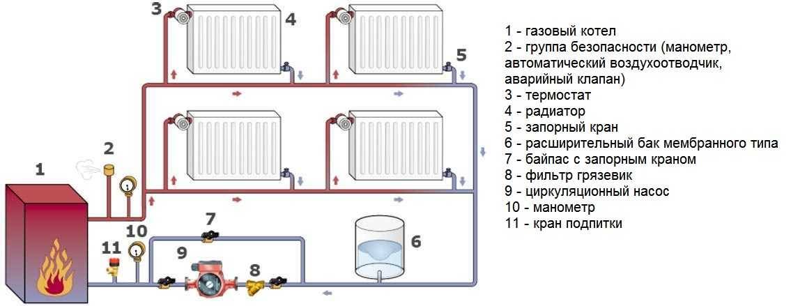 Крайне важно здесь рассчитать необходимую мощность газового котла, всех радиаторов и циркуляционного насоса