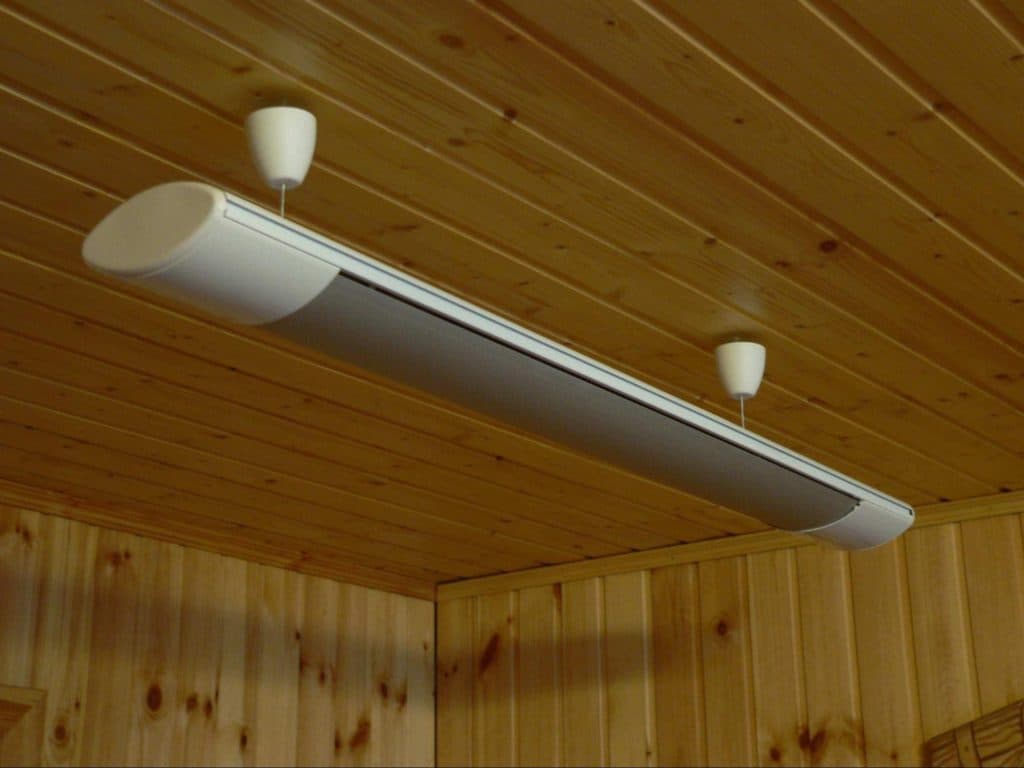 Такие инфракрасные обогреватели являются стационарными. Монтаж их сложнее, чем у предыдущих видов, но все же возможен и своими руками. Единственным недостатком можно считать возможные трудности при установке на подвесные и натяжные конструкции. В этом случае, без определенных навыков, лучше обратиться к профессионалам. Но при этом прогрев помещения будет даже качественнее. Хороши потолочные инфракрасные обогреватели с терморегулятором тем, что температура внизу всегда на 1-2°С выше, чем в районе потолка. Это значит, что в комнате на даче будет намного комфортнее, чем при использовании конвектора, при использовании которого температура возле пола всегда ниже.