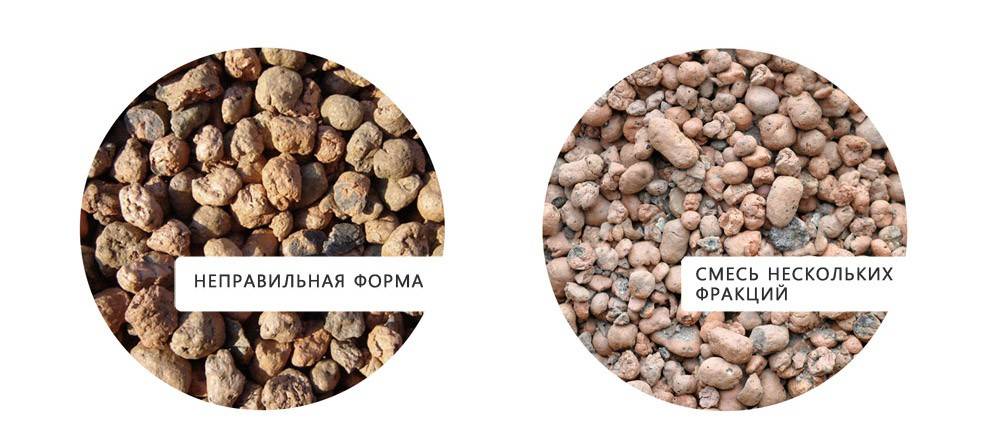 Некачественный керамзит имеет неправильную форму и содержит гранулы разных фракций