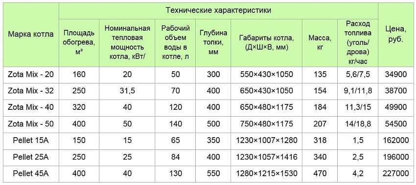 Таблица 1. Твердотопливные котлы Zota Mix и Pellet производства завода отопительной техники и автоматики (г. Красноярск):