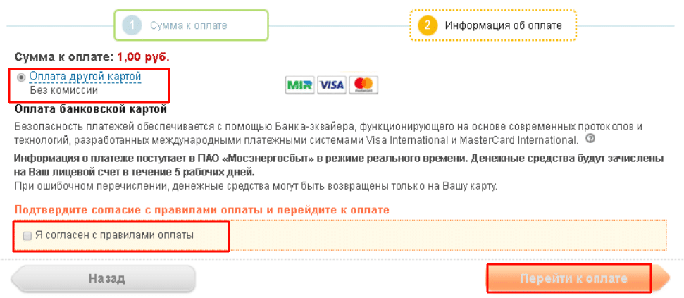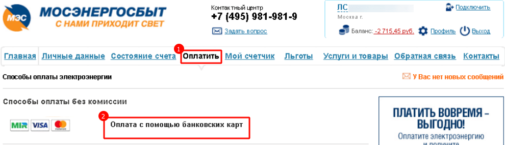 Произвести оплату без комиссии можно через личный кабинет поставщика электроэнергии. Рассмотрим алгоритм действий на примере Мосэнергосбыта. После входа в аккаунт пользователю нужно в верхнем меню перейти в раздел “Оплатить”, а ниже выбрать способ оплаты банковской картой.