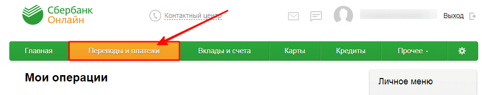 Войдите в личный кабинет привычным способом и в верхней строке меню перейдите в раздел “Платежи и переводы”.