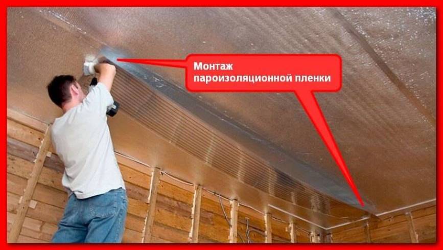 Для теплоизоляции плоской кровли или бетонного потолочного перекрытия изнутри монтируется гидроизоляционная пленка на самоклеющуюся ленту, далее устанавливается обрешетка из дерева или металла.