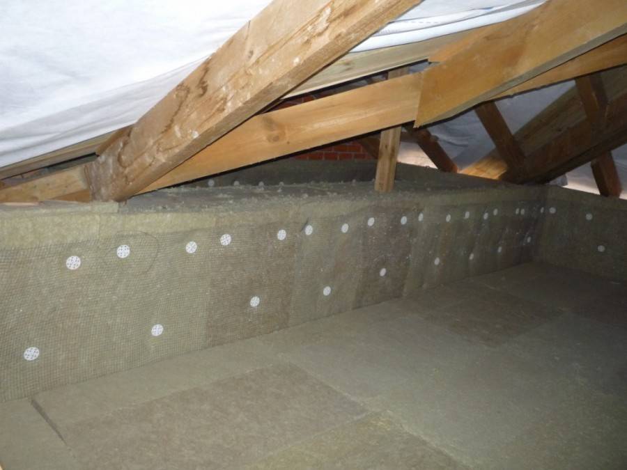 Внутреннее утепление чердака по балкам и стропилам – закладывание минеральной ваты большими брикетами, но полы (обратная сторона потолков) утеплять обязательно.