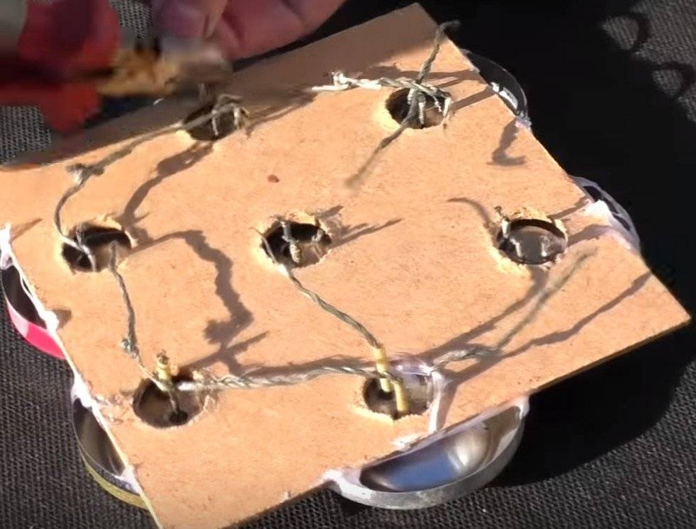 Наша примитивная солнечная батарея из стеклянных диодов готова. На выходе она может давать энергию в пару вольт, что является неплохим показателем для кустарной сборки.