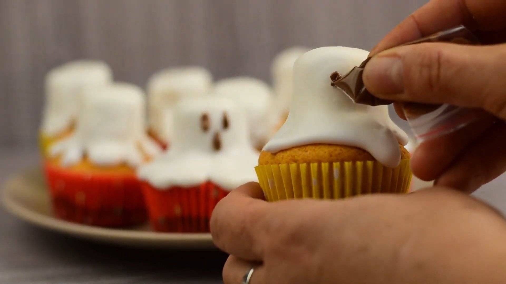 Глаза и рот привидениям рисуем растопленным шоколадом. Милые и симпатичные привидения готовы поднимать настроение вашим гостям.