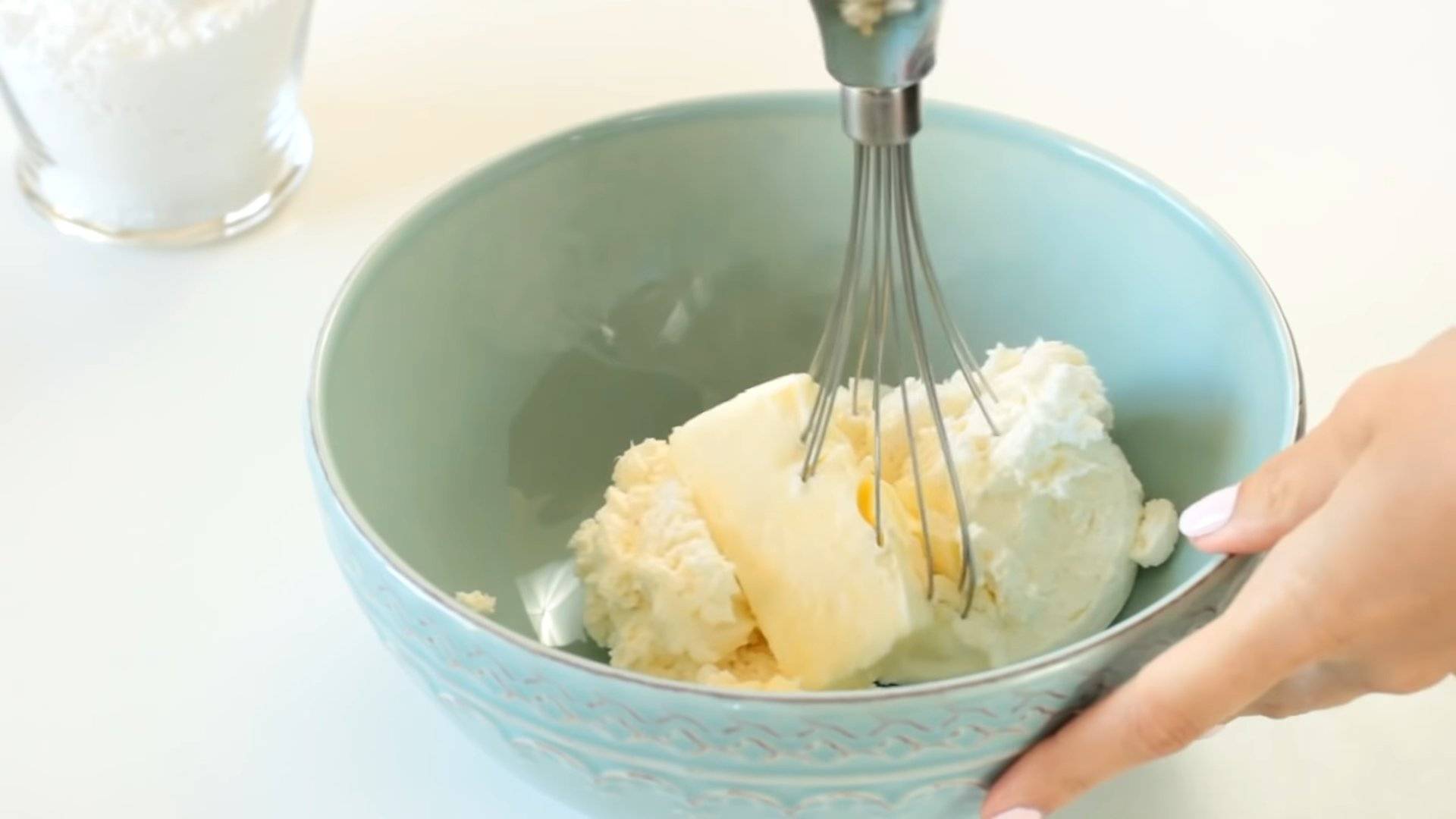 Займемся приготовлением крема. В глубокой миске смешиваем сливочный сыр, 120 г масла и взбиваем их на низкой скорости миксера. Постепенно добавляем 200 г сахарной пудры и хорошо перемешиваем крем до однородности.