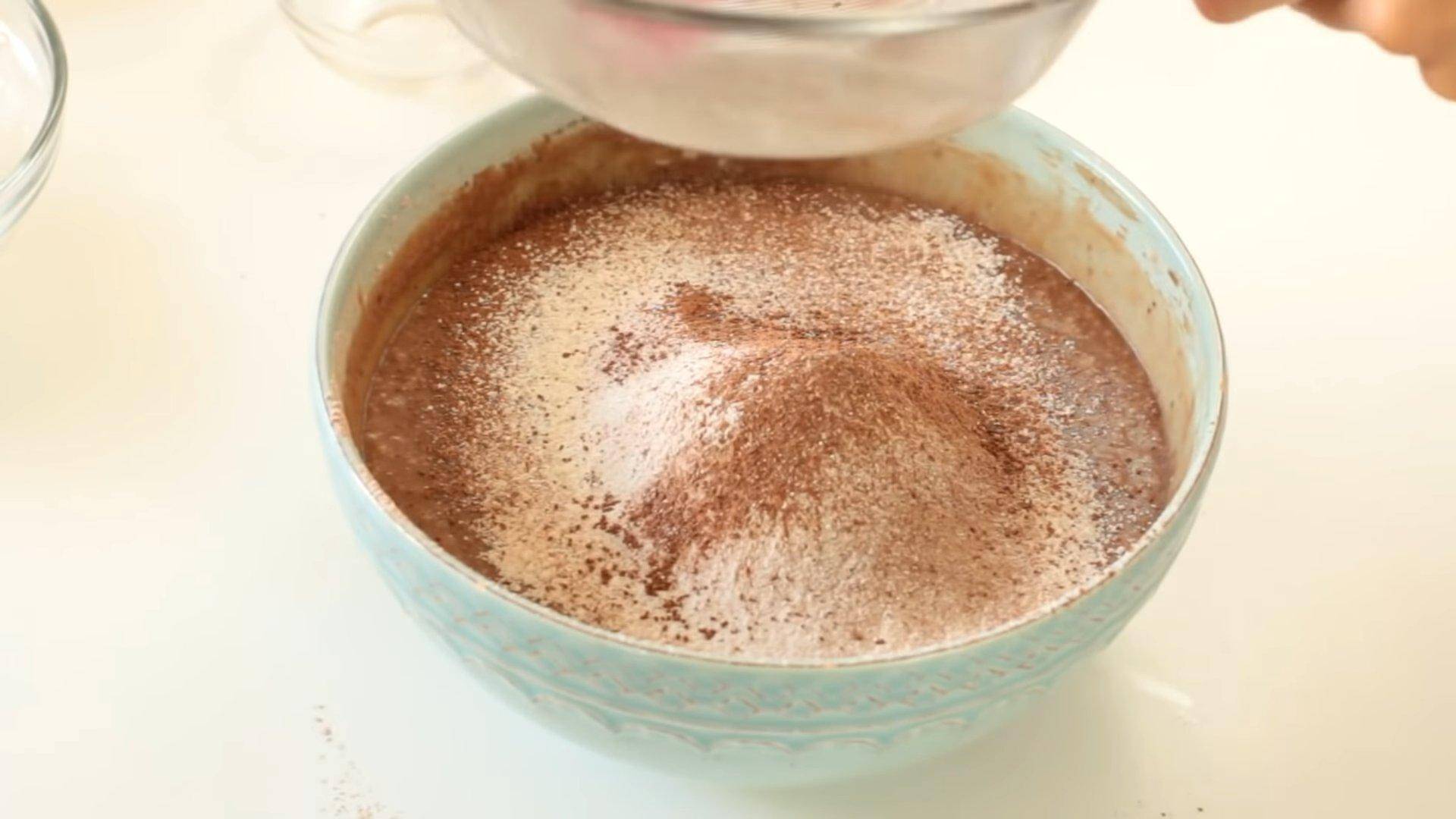 В получившуюся смесь добавляем муку, разрыхлитель, какао и перемешиваем массу до однородности. Желательно просеять эти ингредиенты через сито, чтобы не было комочков.