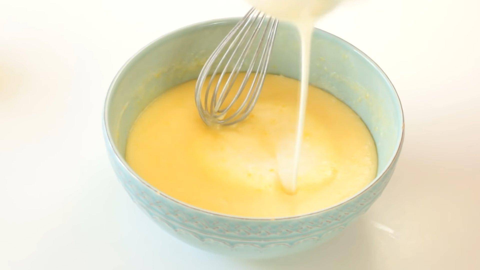 В яичную смесь добавляем растопленное сливочное масло, кефир комнатной температуры и взбиваем венчиком до однородности.