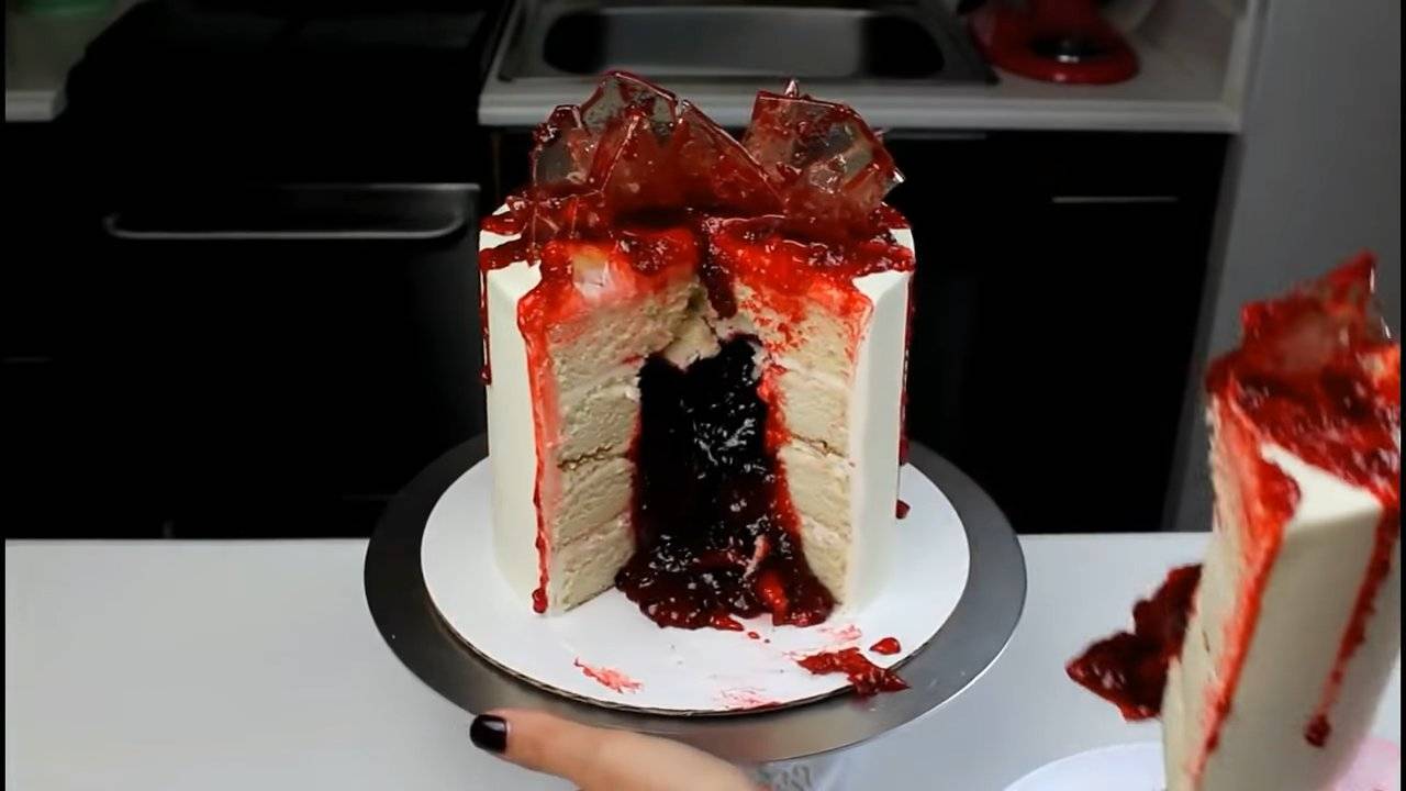 Необычный и очень вкусный торт «Мозги» для вечеринки в честь Хэллоуина готов. Даем ему немного пропитаться и можем подавать на стол.