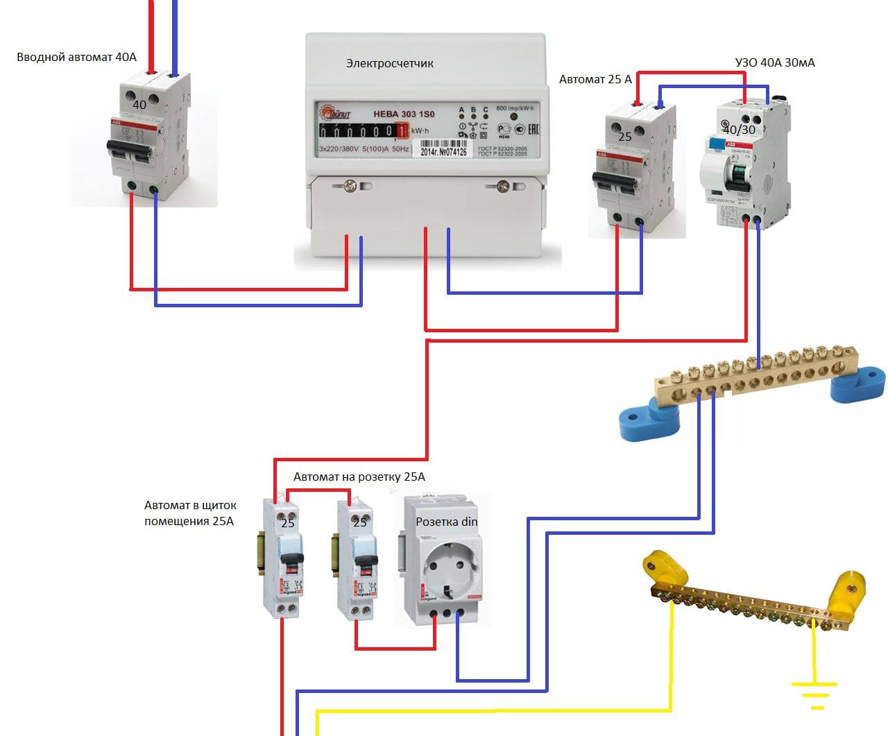 Если планируется устанавливать несколько групп однофазных потребителей, их необходимо равномерно распределить, запитав автоматические выключатели от разных фаз после счетчика.