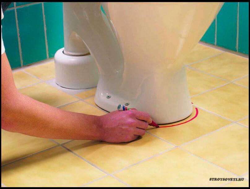 Определите точное место установки унитаза, карандашом через отверстия выполните соответствующие отметки и обведите тем же карандашом контур основания — отметка на плитке впоследствии даст возможность без хлопот поставить его точно на место.