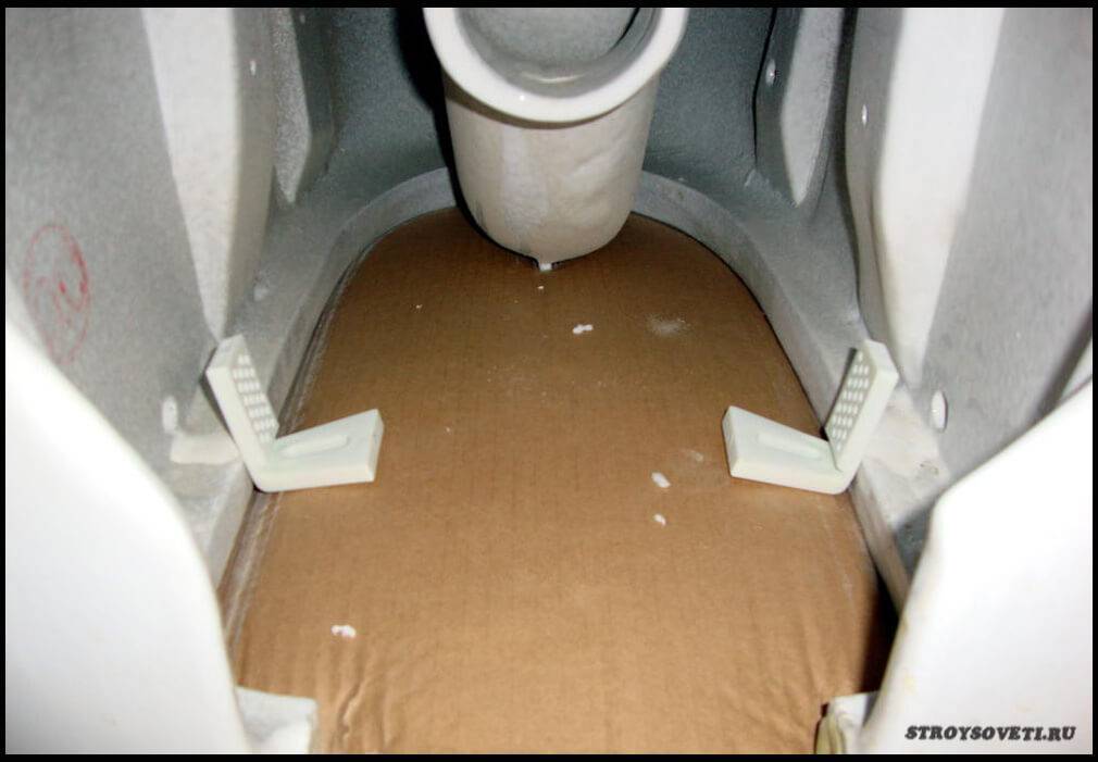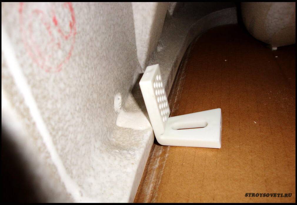 Основание ножки устройства необходимо тоже увлажнить и устанавливать на выделенное для него место. С передней и задней стороны под основание необходимо подложить пластинки из пластика, толщина которых должна быть 5 мм, а ширина 50 мм.