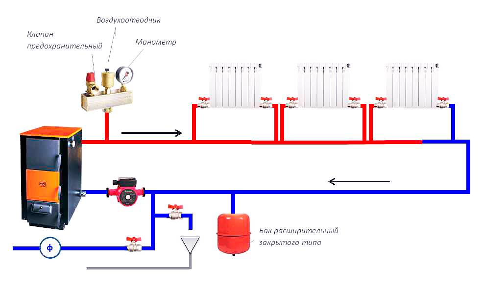 Основной теплоноситель системы подачи тепла — вода. Для ее закачки в трубопровод и радиаторы требуется: