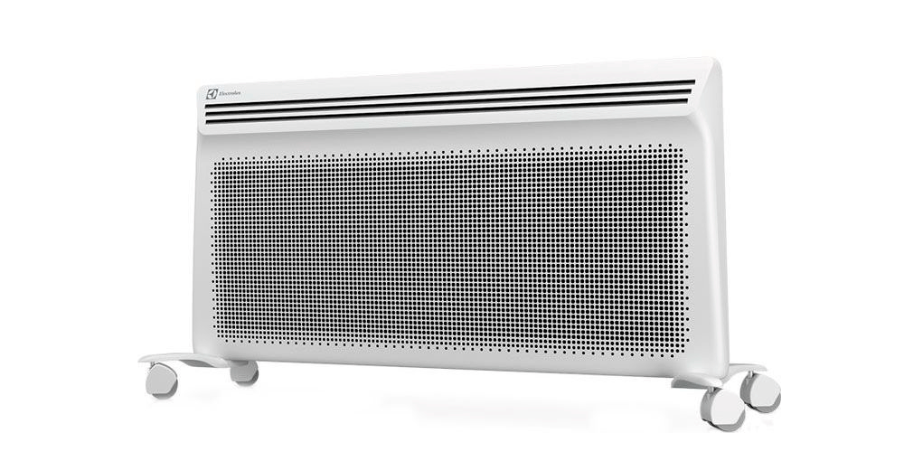 У Electrolux есть крепления для настенного монтажа. Также в комплекте идут ножки с колёсиками, что позволяет перемещать его по комнатам. Панель управления с дисплеем, на котором отображаются выбранные настройки, расположена в верхней части прибора. Можно выбрать один из двух режимов работы и устанавливать время включения по таймеру. При достижении заданного уровня нагрева, Electrolux отключится благодаря наличию встроенного термостата. Эта модель подойдёт для помещений до 25 кв.м. Обогреватель имеет несколько защитных функций: выключение при опрокидывании, при перегреве, режим антизамерзания, родительский контроль.