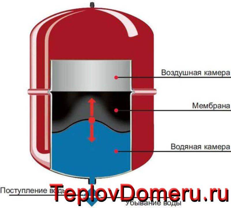 При поступлении воды в первую камеру мембрана растягивается и воздух из второй камеры выходит через специальный клапан. При остывании жидкости мембрана начинает возвращаться в изначальное положение и выдавливает воду обратно в систему отопления.