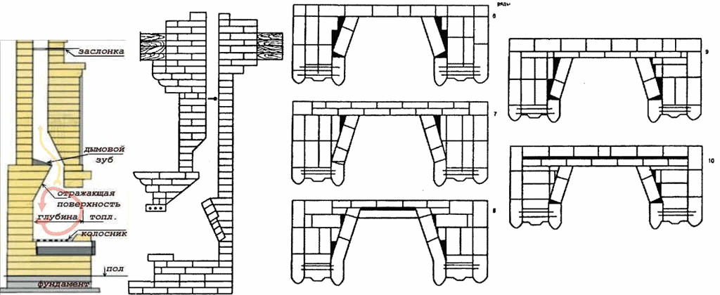 Задняя стенка выкладывается 10 рядами обычным способом, то есть горизонтально. Начиная с 11 ряда, кирпич выдвигается на четверть под углом 30 градусов во внутреннюю часть топки. Таким действием образуются перевал каминного зуба, в швы между кирпичами вставляются металлические штыри далее, к ним будет крепиться лист из металла.