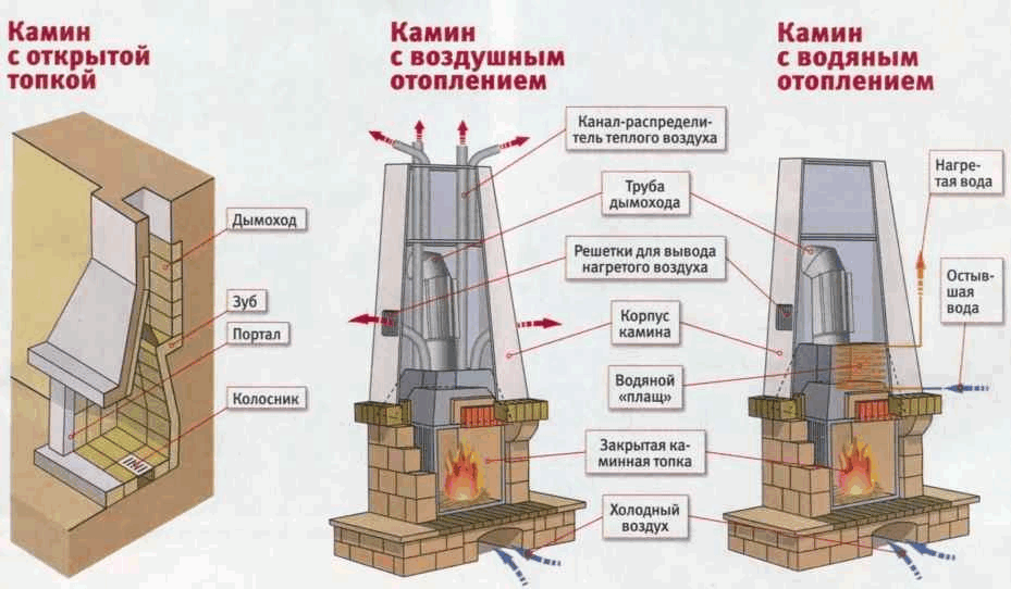Дровяные сооружения могут быть традиционными (из кирпича или камня, преимущественно с открытой топкой) или чугунными (стальными). Для таких каминов требуется тщательная проработка проекта, особенно в части дымохода.