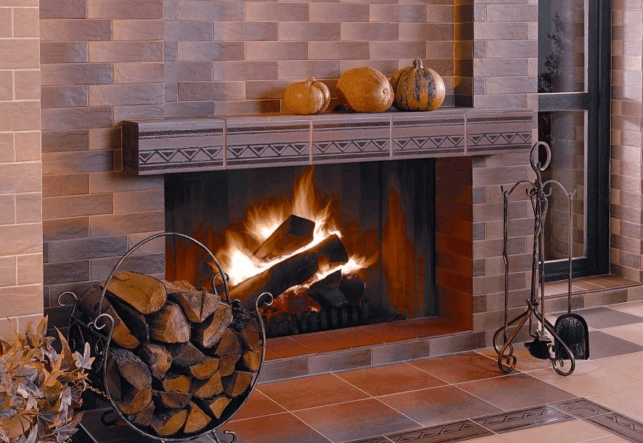 В качестве отделочного материала для камина хорошо подойдет плитка, поверхность которой имитирует камень