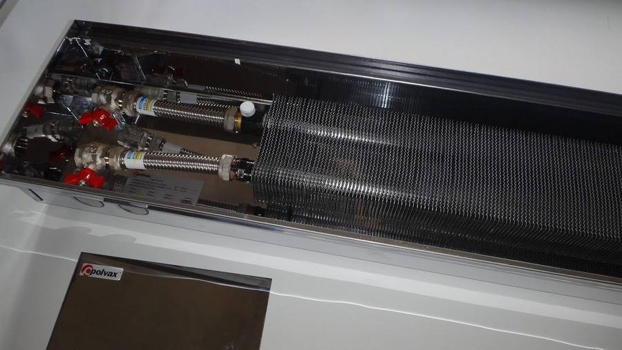 Нагревательный элемент при помощи труб подключается непосредственно к централизованной системе сооружения или здания и использует ее теплоноситель в своей работе. Зачастую встроенные в пол конвекторы отопления устанавливают в дверных проемах квартиры, тамбурах, зимних садах, на лестничных площадках и пр.