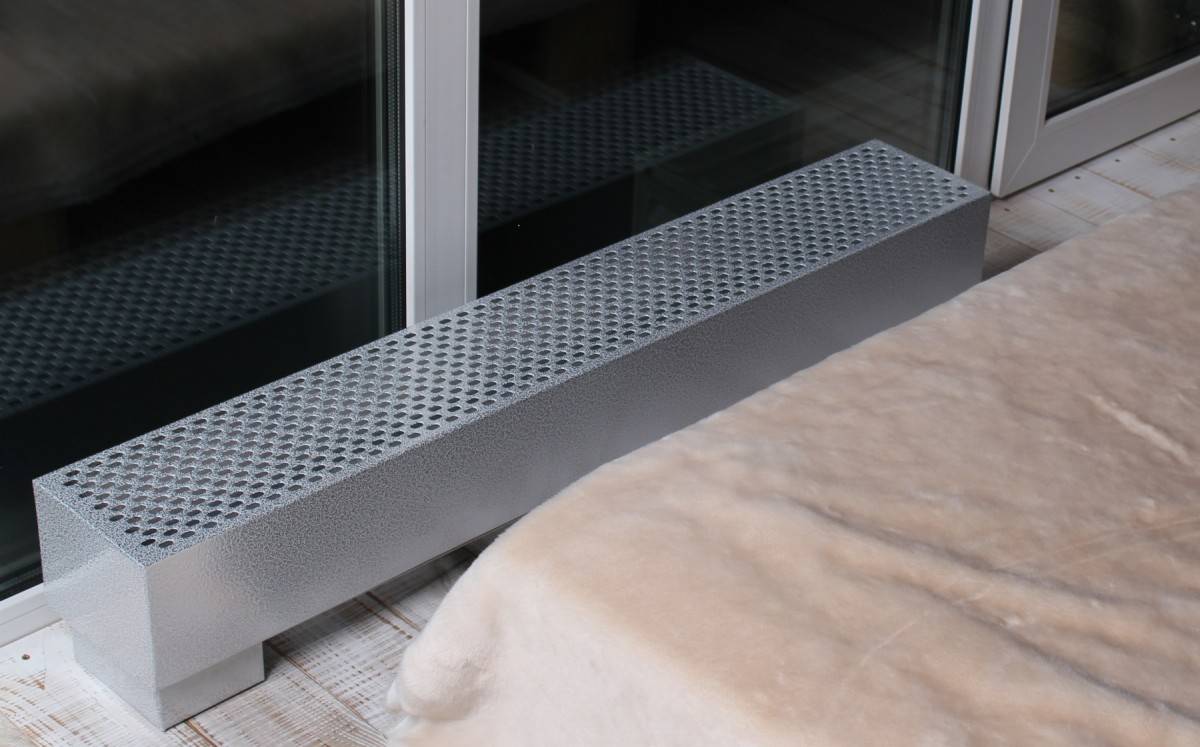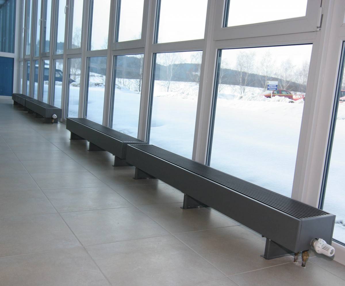 Напольные конвекторы нередко используются в помещениях с панорамными окнами. В этом случае трубы для подводки горячего теплоносителя укладываются в пол. Установка обогревателей сводится к их закреплению и подключению к отопительной системе. Используя самые низкие и компактные модели, можно добиться идеального обзора из окна и качественного обогрева помещений.
