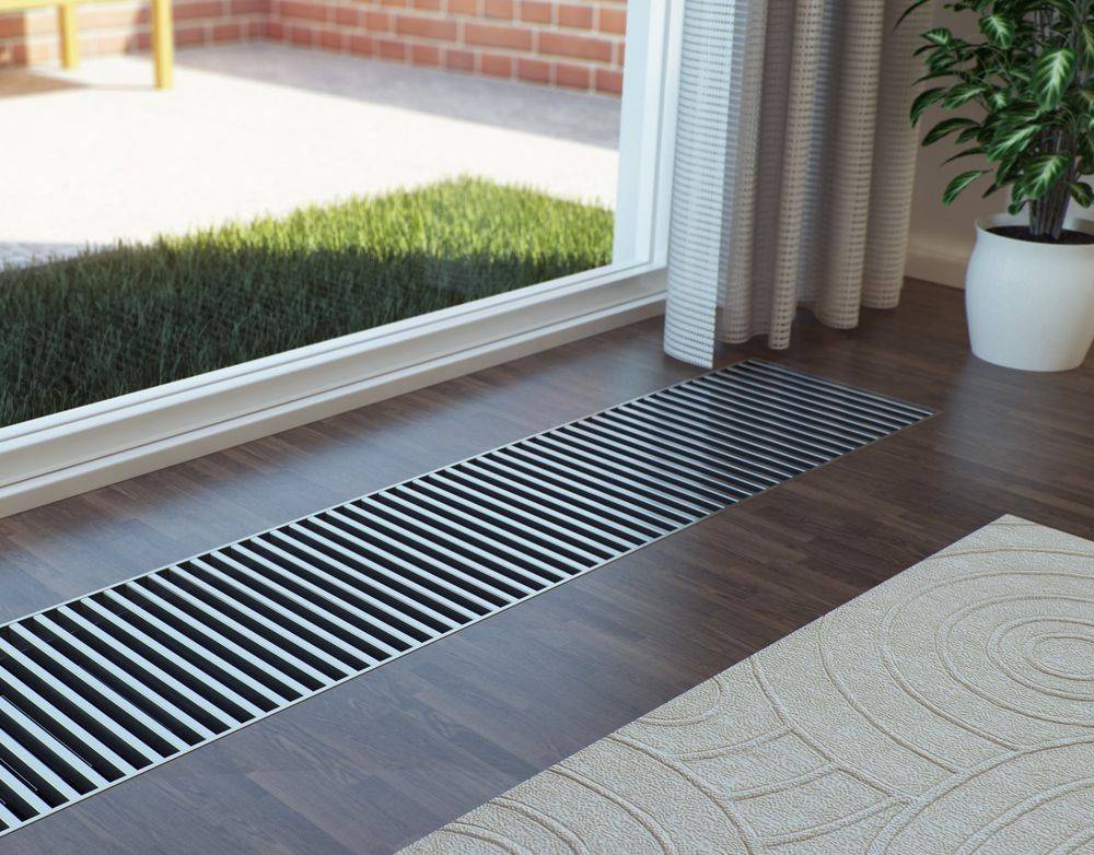 Внутрипольные водяные конвекторы отопления станут находкой для тех, кто хочет создать максимально скрытую отопительную систему. Как видно из их названия, они утапливаются прямо в полы, где под них создаются специальные ниши. Там же прокладываются трубы, по которым циркулирует теплоноситель. Один внутрипольный водяной конвектор большой ширины обеспечит качественный прогрев и не испортит интерьер своим внешним видом – догадаться о присутствии такого обогревателя можно лишь по маскирующей решетке в полу.