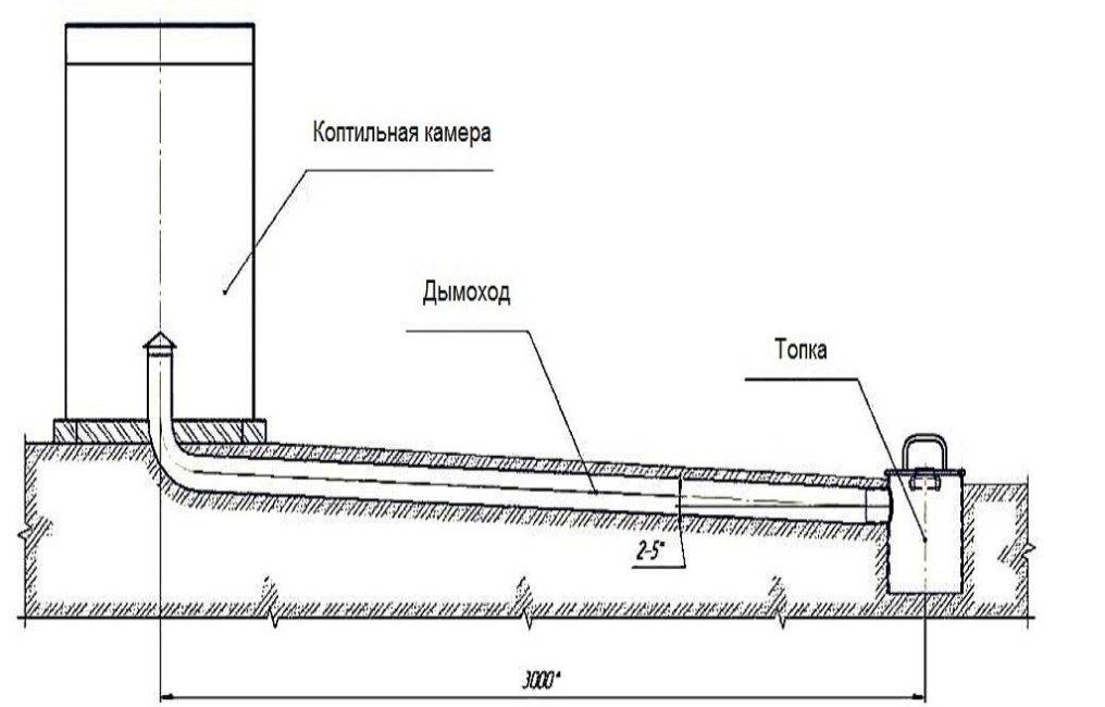 Играющая роль топки железная ёмкость соответствующего объёма вкапывается в землю ниже уровня коптильной камеры. При таком расположении топки дымоход от коптильной камеры прокладывается тоже в земле, а это позволяет охлаждаться дыму.
