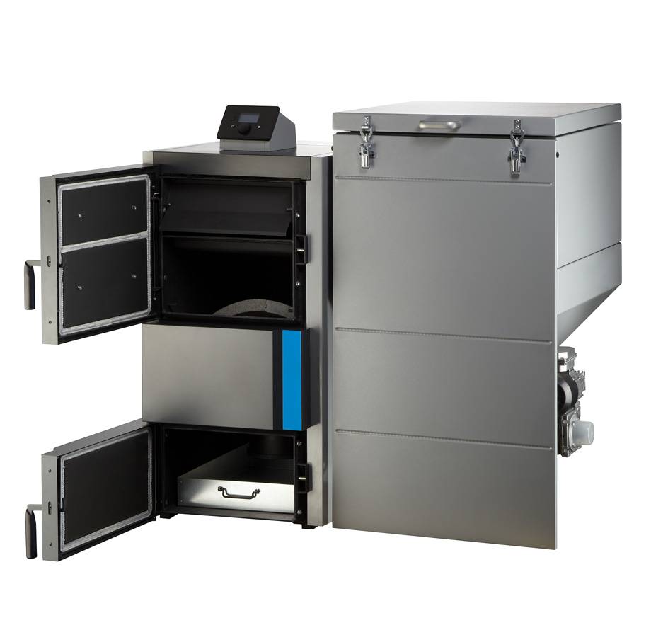 КПД этой модели твердотопливного котла равен 90%. В качестве топлива может использоваться уголь, а также пеллеты. Продолжительность полного сгорания загруженного топлива составляет от 50 часов. Удобность эксплуатации обеспечивается благодаря установлено автоматической системе удаления скопившейся золы.