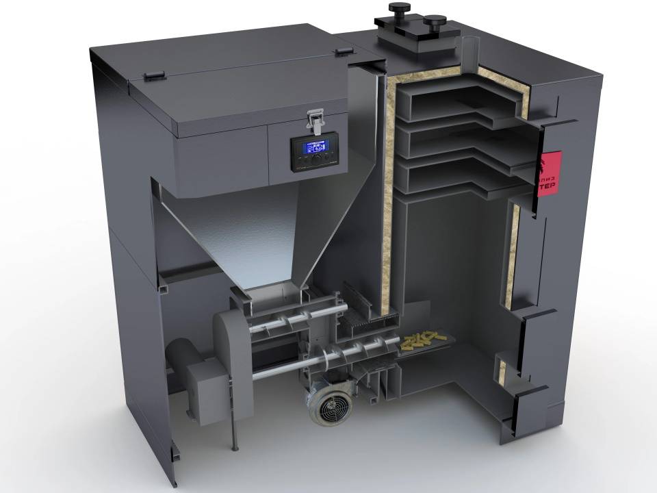 В больших загородных коттеджах, а также на промышленных предприятиях в качестве отопительных приборов, использующих пеллеты, устанавливают котлы. Их мощность варьируется в пределах 15–100 кВт. Если монтаж пеллетных котлов происходит в частном доме, то оптимальное место для их размещения – подвал. Различают несколько типов подобных устройств:
