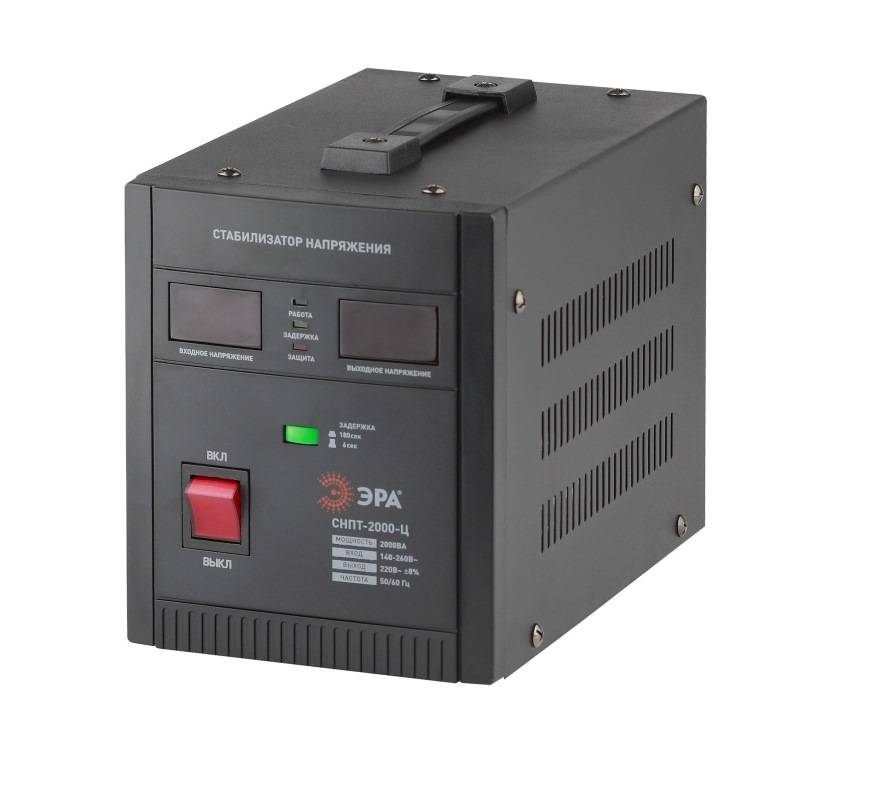 Переносной стабилизатор в стальном корпусе. Работает с напряжением от 140 до 260 Вольт. Для подключения электроприборов предусмотрено 2 розетки. В корпусе есть множество отверстий, обеспечивающих естественное охлаждение внутренних узлов. Вес около 4 кг.