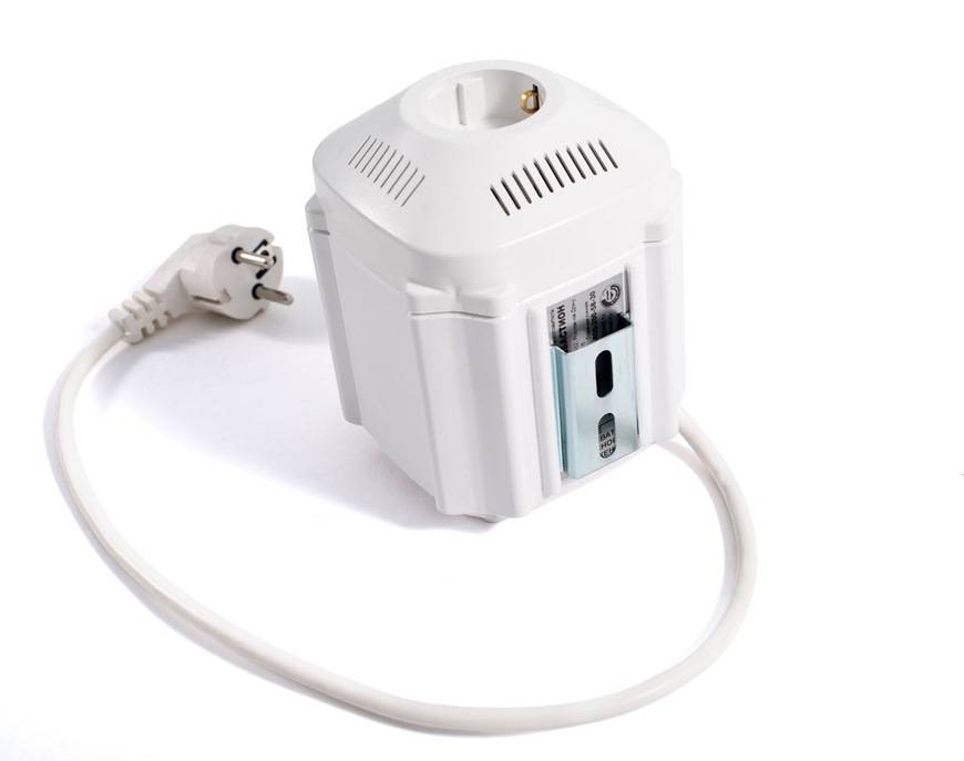 Аппарат релейного типа, работает в диапазоне от 140 до 260 Вольт. Внутренние элементы помещены в металлический корпус, вес прибора немногим более 2 кг. Крепление настенное.