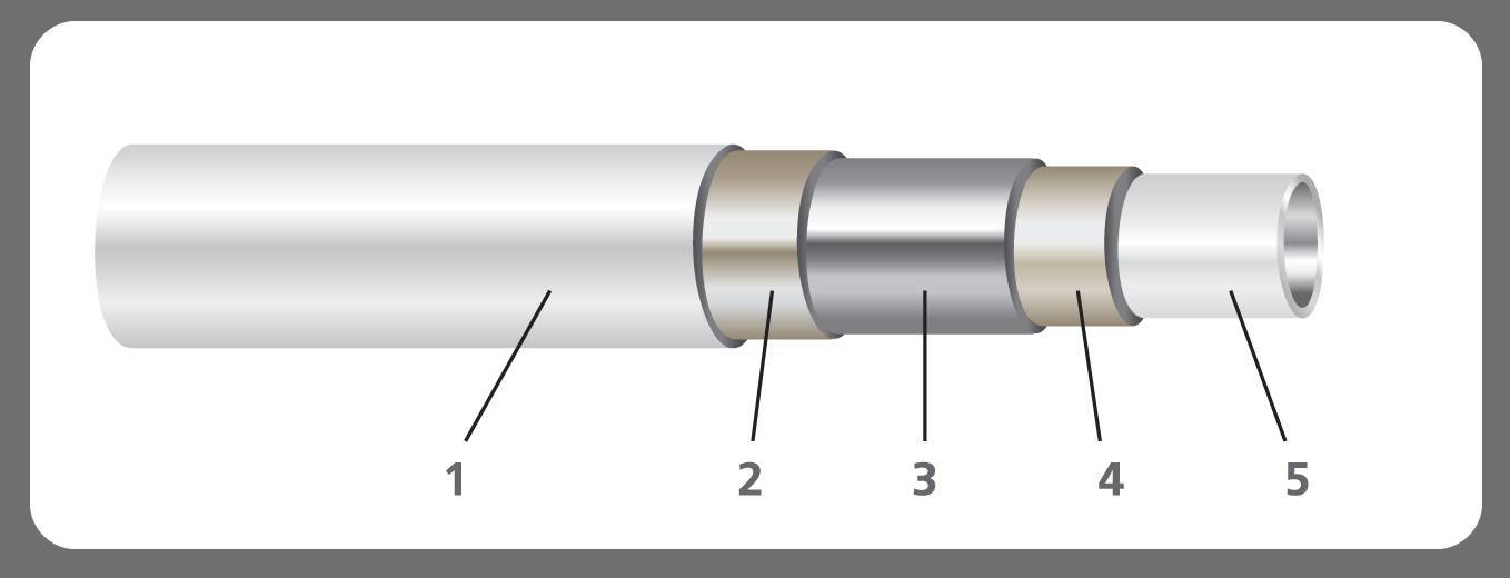 Внешний слой трубы защищает алюминий от воздействия кислорода и влаги. Алюминиевая фольга обеспечивает прочность изделия, а внутренний слой предназначен защитить изделие от воздействия рабочей среды и образования конденсата.