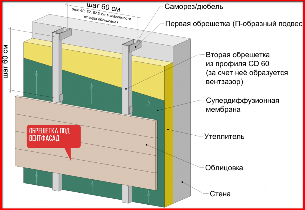 После надлежащей фиксации минераловатной изоляции, производится установка обрешётки, соблюдение пространства для проветривания и монтаж декоративной отделки.