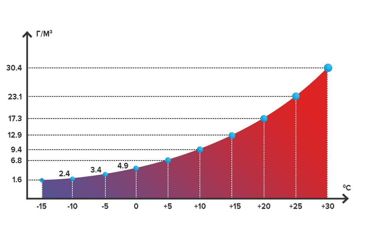 Рассмотрим любую температурную точку. Пусть будет +20 °С. Допустим, вы сушите бельё в ванной комнате. Влажность в помещении постепенно повышается, но только до определённого предела. При +20 °С 1 кубометр воздуха может растворить до 17,3 г воды. Всё, что больше – осядет на стенах и потолке в виде конденсата (росы). Соответственно, пока влаги менее 17,3 г, то конденсата при +20 °С не будет.
