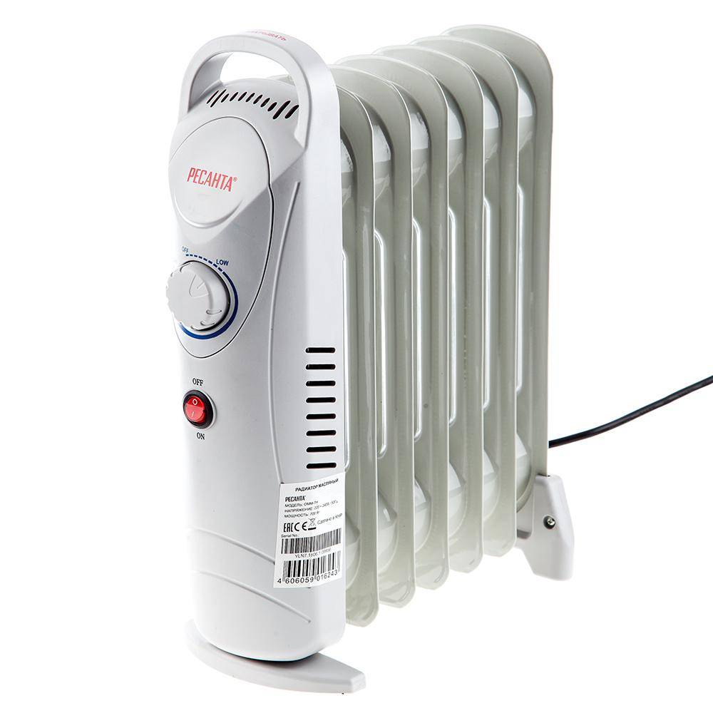 А вот небольшой масляный обогреватель от бренда «Ресанта», который потребляет всего 700 Вт. Такая мощность разрешает применять его только в гаражах 7 м², где хранится мотоцикл или скутер. В более просторных помещениях его присутствие не ощутимо. Аппарат имеет один режим работы и термостат. Последний выполняет роль включающей кнопки и регулировки температуры. Радиатор состоит из 7-ми секций, установленных на изоляционные ножки. Для переноса в разогретом состоянии предусмотрена рукоятка. Судя по отзывам, греет батарея хорошо, но пользователям не хватает длины сетевого шнура, составляющей 140 см.
